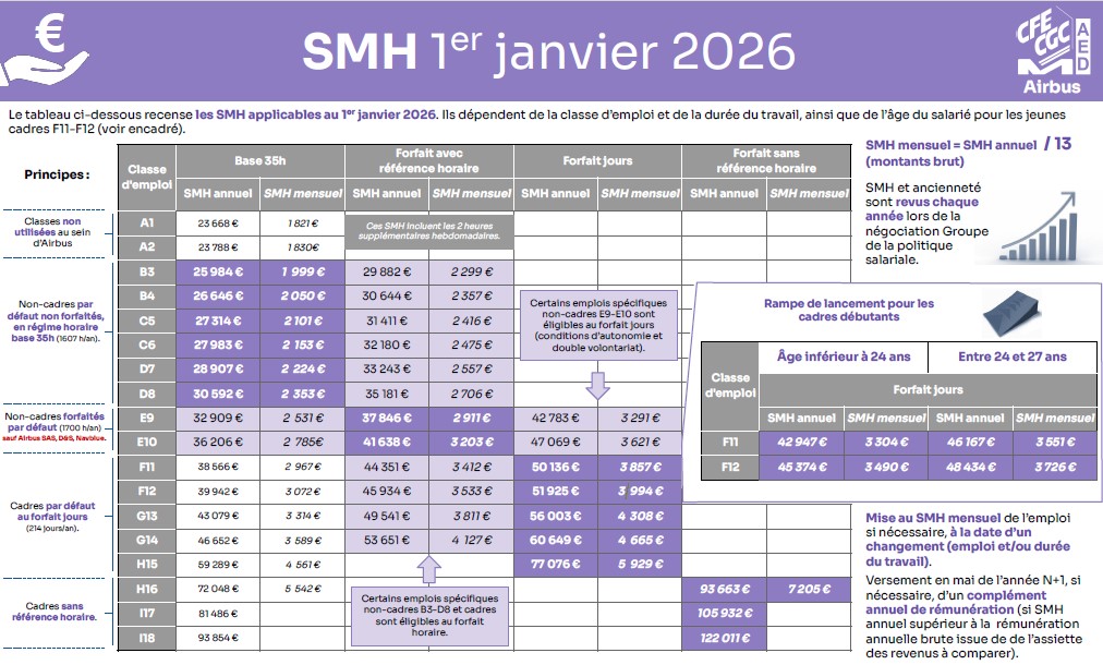 Le changement de salaire minima hiérarchique de la rampe de lancement se fait au 1er janvier de l’année qui suit le 24e anniversaire du salarié. A compter du 1er janvier de l’année suivant son 27ème anniversaire, le salarié se voit appliquer les montants du barème unique des salaires minima hiérarchiques du groupe Airbus correspondant à la classe d’emploi et la durée du travail qui lui est applicable.